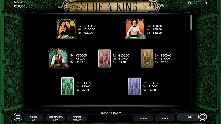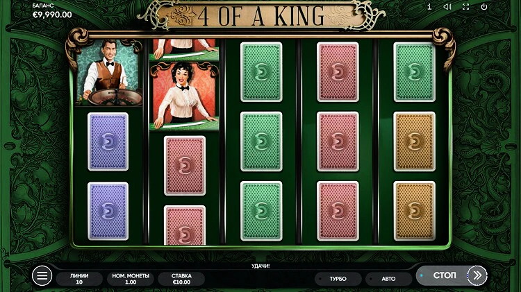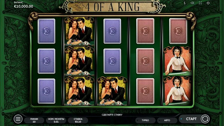 Компания Endorphina выпустила игровой аппарат 4 of a King 10 лет назад, в 2014 году. В игре представлены классические карточные игры, которые можно было встретить в старых наземных казино. На барабанах изображены игроки, крупье и карты с рубашками разного цвета. Специальный символ — вайлд, который распространяется на соседние позиции.