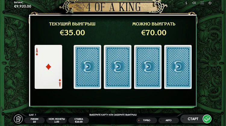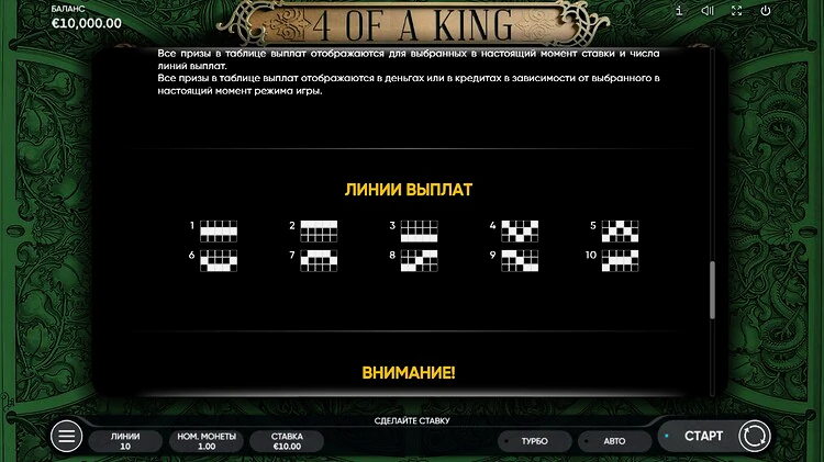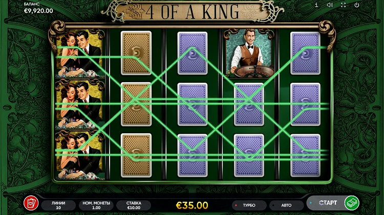 Игра в слоте 4 of a King происходит на пяти барабанах и трех рядах. Ставки можно делать на десять игровых линий, количество которых можно отрегулировать, нажав на соответствующую кнопку в левом нижнем углу.
