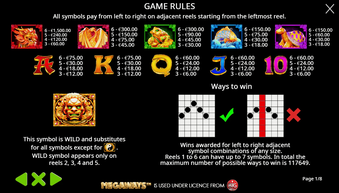 Дракон от х1 до х25, феникс от х0.75 до х5, лягушка от х0.5 до х5, карп и черепаха от х0.3 до х2.5. Младшими символами являются буквы. Например, призовая сетка при выпадении пиктограммы J от х0.1 до х1. Максимальное вознаграждение за спин удастся получить, если на линии одна картинка выпадает на всех 6 барабанах. Минимум дается за выпадение 3 элементов. Награды за 4 и 5выпавших комбинаций усредненные.