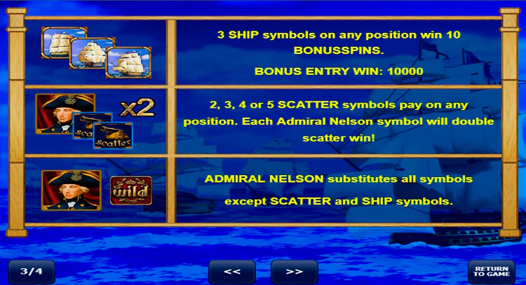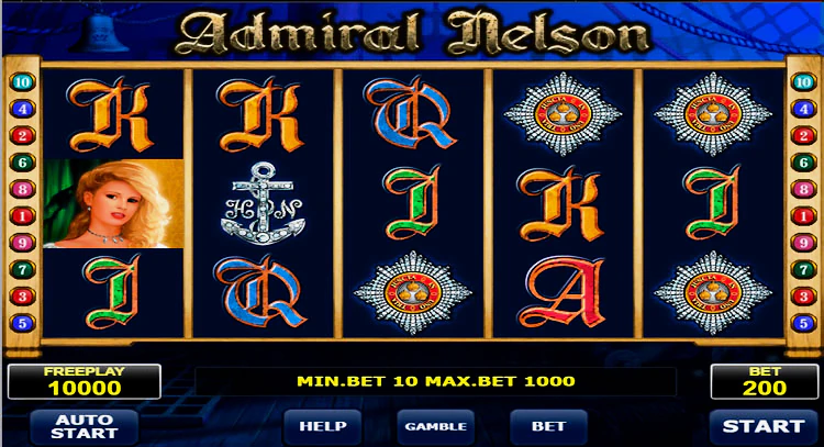 Видеослот под названием Admiral Nelson — творение компании Amatic Industries, с 5 барабанами и 10 линиями выплат. Игра погружает в повествование об адмирале Нельсоне, главнокомандующем британским флотом середины 18 века. В игре представлены захватывающие изображения морских пейзажей, дополненные анимированными элементами, которые придают игре живость и реалистичность. Дизайнеры приложили немало усилий, чтобы передать тематику слота, продемонстрировав потрясающий дизайн, который превосходит их типичный стиль.