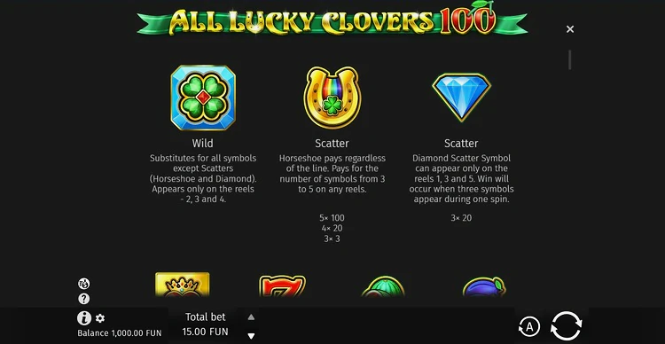 BGaming постоянно предлагает заманчивые бонусы в своих слотах, и All Lucky Clovers — не исключение. В этой игре есть специальные символы и расширяющиеся вайлды. Символ клевера представляет собой дикий символ и появляется на 2, 3 и 4 барабанах соответственно, позволяя заменять все символы, кроме бриллианта и подковы. Такая универсальность облегчает формирование выигрышных комбинаций.