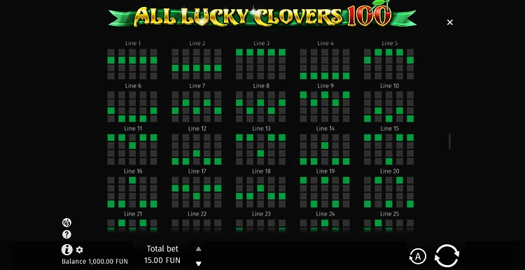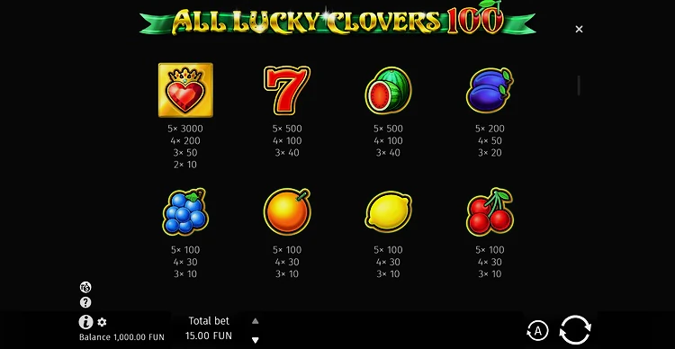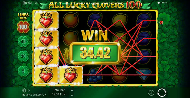 Сегодня вам предстоит отправиться в захватывающее путешествие с игровым автоматом All Lucky Clovers от студии BGaming. Данная версия популярного слота Four Lucky Clovers предлагает четыре уникальных режима игры, давая игрокам возможность выбрать 5, 20, 40 или 100 линий выплат. Игра обладает увлекательной тематикой с символами клевера, фруктов, семерок, подков и бриллиантов.