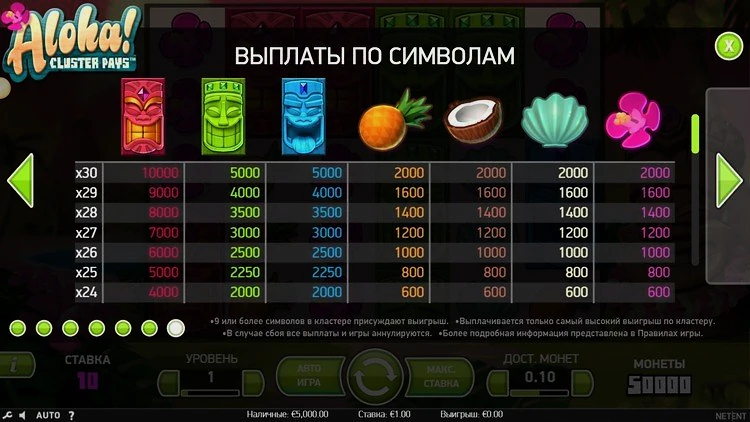 Хотя таблица выплат Aloha Cluster Pays не радует обилием символов, каждый из них соответствует тематике игры и выполнен в яркой цветовой палитре, которая выделяется на барабанах.