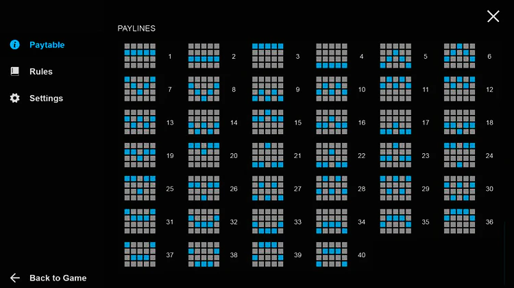 В этой игре есть 40 выигрышных линий, расположенных на пяти барабанах, которые распределены по четырем рядам. Игра простая, без сложных бонусов.