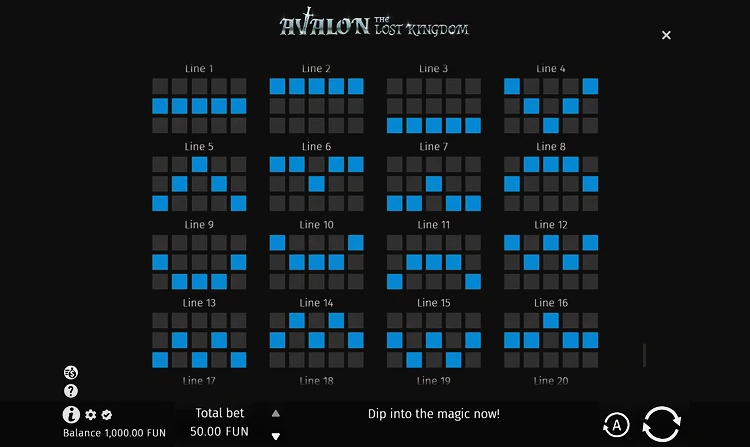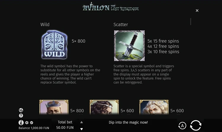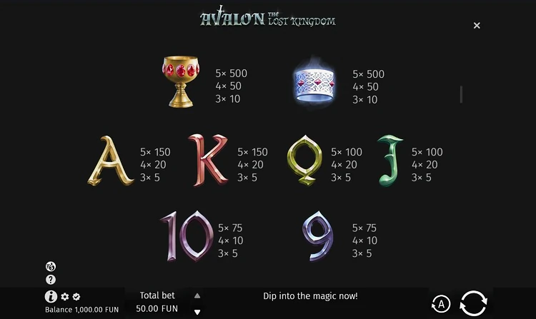 Avalon: The Lost Kingdom отличается исключительными иллюстрациями и качественной тематической стилизацией. Игра имеет аутентичные фоновые пейзажи и увлекательный геймплей, обещая интерактивный и захватывающий игровой процесс. Приготовьтесь к путешествию в мир приключений в Avalon: The Lost Kingdom, в котором вас ждут многочисленные бесплатные вращения, множители от 2 до 7, интригующая функция Excalibur и загадочные символы Wilds.