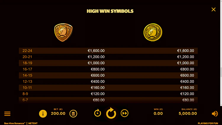 На щитах различных форм и размеров изображены рабочие пчелы, а также вы найдете милые мультяшные версии с прилагаемыми значениями множителя. Король (или это должна быть королева?) Пчела имеет наибольшую ценность. Среди других бонусных символов — улей с башенками и богато украшенная эмблема разброса в виде золотого горшочка с медом.