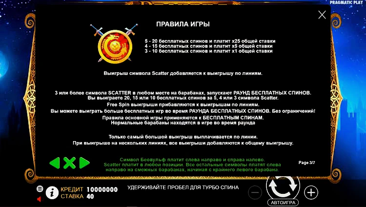 Нужно нажать Play, чтобы установить диапазон ставок в бесплатном онлайн слоте Beowulf. Рядом с ним есть символы плюс и минус, которые укажут направление. Хотя нельзя изменить количество линий выплат, можно выбрать количество монет, с которыми игрок хочет погрузиться в развлечение, от 1 до 10.