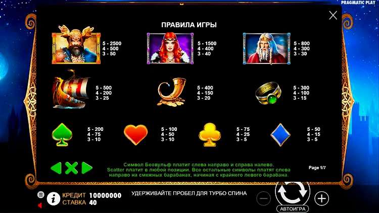 Как и в других видах развлечений, карточные символы в демо-режиме слота Beowulf от Pragmatic Play являются наименее ценными в таблице выплат. Blue Diamond заплатит пять за три изображения, 15 за четыре и 50 за пять. Yellow club стартует с 5x за три и 75 за пять. Следующее значение — красное сердце: 10x для троих и 100 для пятерых. Зеленая лопата начинается с 10 для троих и 200 для пятерых.
