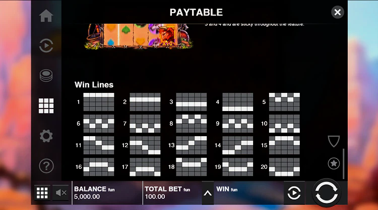 Всего имеется 20 фиксированных линий выплат, которые активны на каждом вращении.