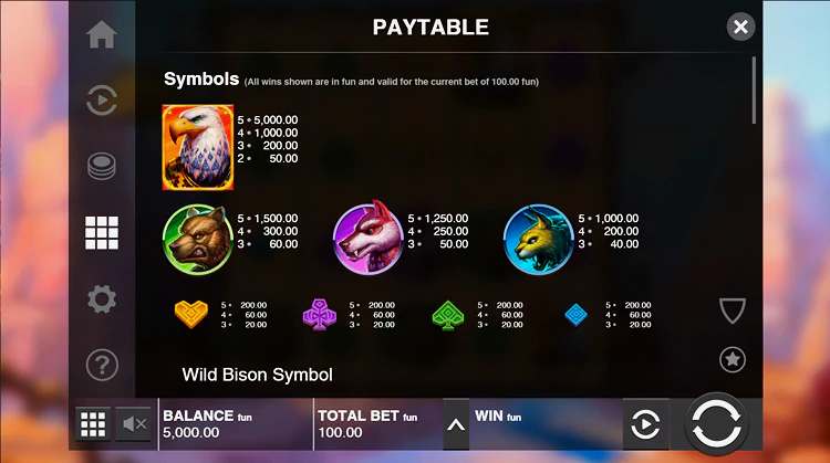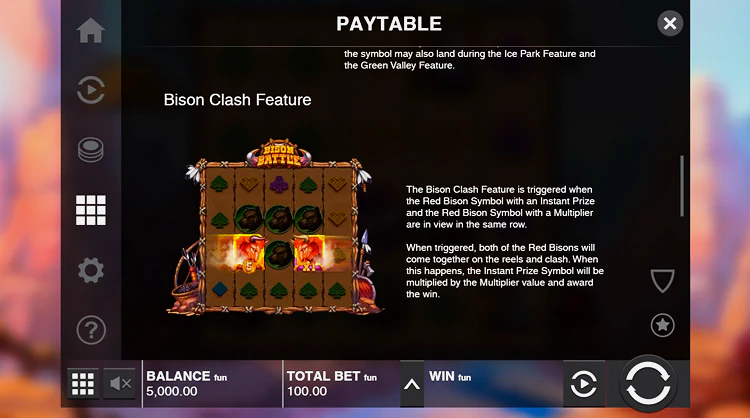Играть в Bison Battle максимально просто. Запустив игру, отрегулируйте ставку по своему усмотрению и ознакомьтесь с таблицей выплат, чтобы понять значения символов и правила бонусных функций.