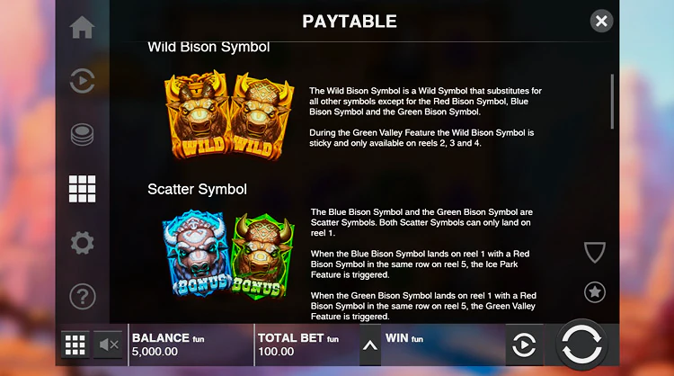 Еще одна примечательная функция активируется при столкновении красного и зеленого бизонов на 1 и 5 барабанах, активируя бонус Green Valley Bonus. Этот функция бесплатных вращений, во время которой все появляющиеся символы Wild становятся липкими, а символы бизонов получают дополнительные множители, увеличивающие возможность получения значительных выплат.