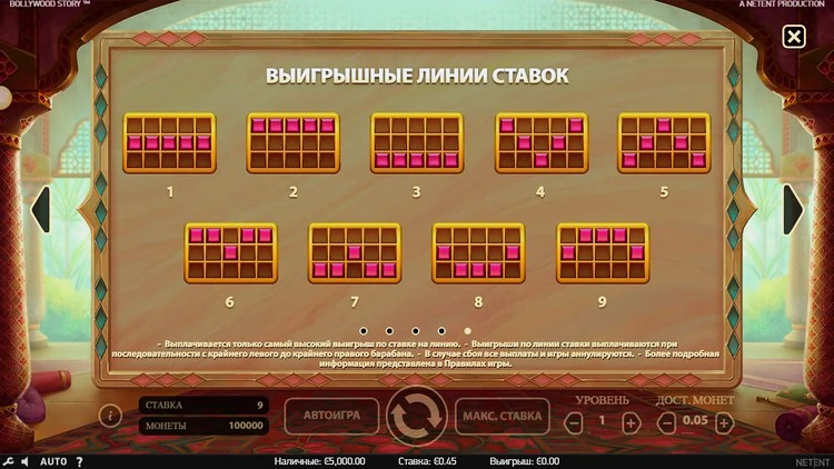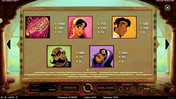 В онлайн-слоте Bollywood Story от NetEnt 9 линий выплат. Доступен широкий спектр вариантов ставок, поэтому, несмотря на фиксированную ставку, игроки могут поставить от 9 пенсов до 90 фунтов стерлингов за спин, что делает эту игру отличным выбором как для игроков с ограниченным бюджетом, так и для тех, кто располагает большими банкроллами.