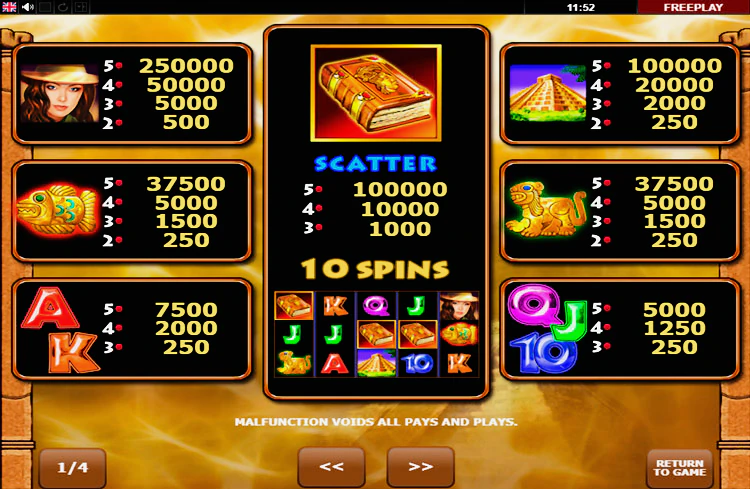 Символ книги в слоте Book of Aztec выполняет двойную роль — Wild и Scatter. В качестве Wild он может заменить любой другой символ, чтобы помочь создать выигрышные комбинации. Когда три или более скаттеров появляются в любом месте на игровом поле, запускается функция Extra Spins, которая награждает игрока десятью бесплатными вращениями. Раунд с фриспинами может быть перезапущен, если во время дополнительного раунда выпадет три или более символа книги.