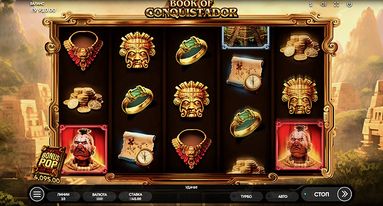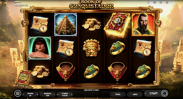 Book of Conquistador — это вклад компании Endorphina в категорию игровых автоматов о Южной Америке. Барабаны 5×3 с 10 линиями выплат, используемые в Book of Conquistador, типичны для жанра. Они ценны из-за комбинаций, увеличивающих выигрыш минимум в два раза. Максимум выплачивается до х5000 ставки, а RTP слота составляет 96,05%. Что касается используемых функций, то к ним относятся вайлды, скаттеры, бесплатные вращения и специальные расширяющиеся символы. В обзоре подробнее рассмотрим все преимущества игрового автомата.