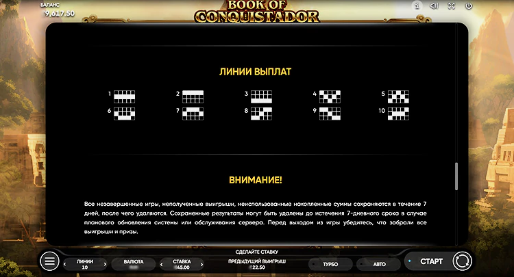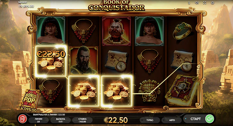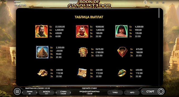 Диапазон ставок составляет как $0,01 на 1 линию, так и $45 на спин. При активных 10 линиях минимальная ставка — $0,10. В слоте Book of Conquistador может быть выплачено до 5 000 раз больше установленной суммы, если выпадут высокооплачиваемые комбинации на всех 10 линиях (х500 за каждую из них).