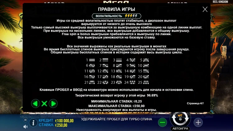 Чтобы выиграть в слоте необходимо собрать как минимум три символа в одну из двадцати пяти активных линий автомата.