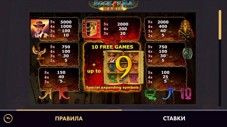 Book of Ra Magic предлагает различные символы для выплат, направленные на увеличение вашей прибыли Самым ценным символом является бесстрашный герой игры, который оплачивается 500x от вашей ставки. Среди других символов — синий скарабей и золотая маска сфинкса. Символы меньшего достоинства – стандартные карточные номиналы 9, 10, J, Q, K и A. Волшебная книга служит одновременно диким и скаттер-символом, заменяя собой все остальные для создания выигрышных комбинаций.