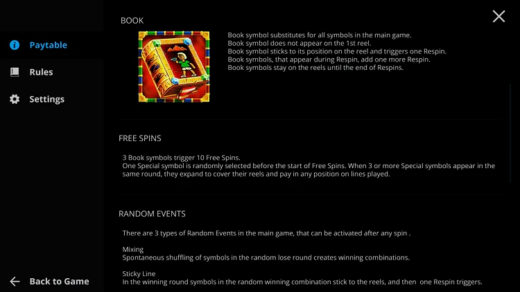Нетрудно догадаться, что книга играет особую роль в слоте Book Of Rest. Она является диким, заменяет любые символы. Книга выпадет только на первом барабане, не двигается, но дает один риспин. Есть и другие бонусные функции. Фриспины запускаются при выпадении 3-х wild. Случайные события запускаются в хаотичном порядке во время основной игры: