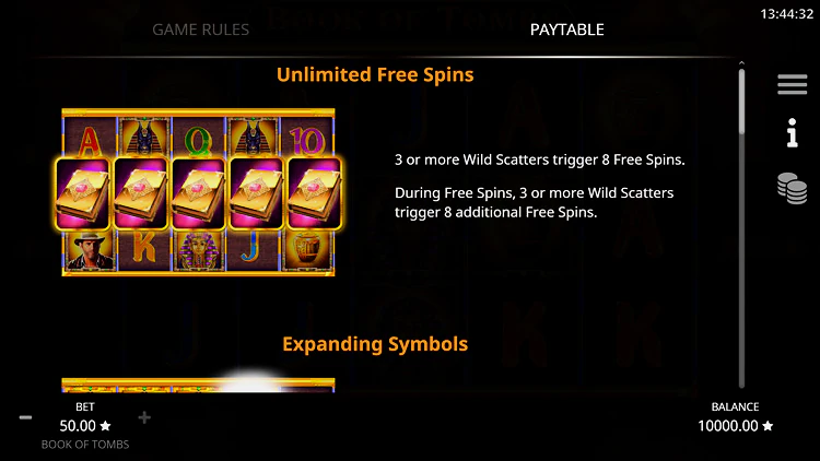 В игре Book of Tombs есть расширяющиеся символы во время неограниченного раунда бонусных бесплатных вращений.