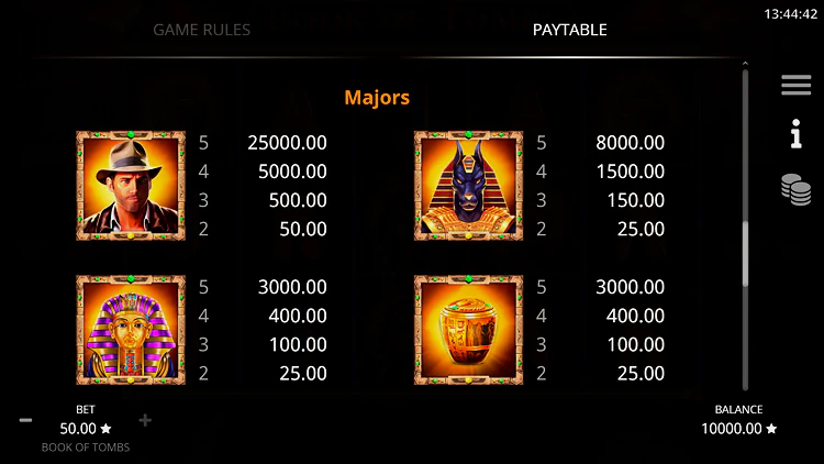 В Book of Tombs с минимальной ставкой есть десять выигрышных символов, включая дикий символ, который также выполняет роль символа разброса.