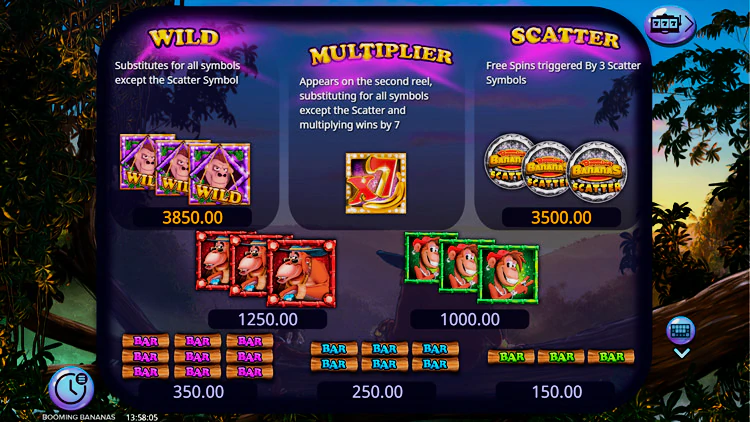 Booming Bananas — это игровой автомат, который сочетает в себе классическую структуру и современный дизайн, а разработчики слота черпали вдохновение в образах обитающих в джунглях обезьян.
