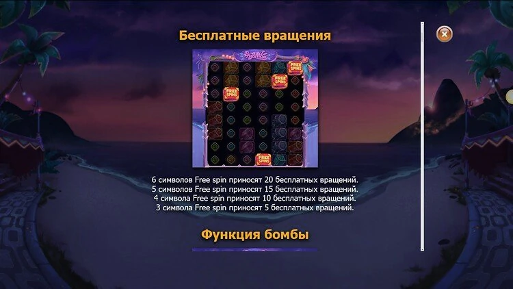 Еще одна особенность основной игры — бонус Бомба. Бомбы могут упасть на 2, 3, 4 и 5 барабаны, создавая взрыв в форме звезды, который очищает 16 позиций, увеличивая ваши шансы на выигрыш. Также доступен множитель, отображаемый в левой части экрана, который активируется при падении бомбы или выигрыше. С каждым новым выпадением символа множитель увеличивается на единицу. Если вам не удастся составить новую комбинацию, он обнуляется. Во время бесплатных вращений множитель не сбрасывается и продолжает увеличиваться до конца функции.