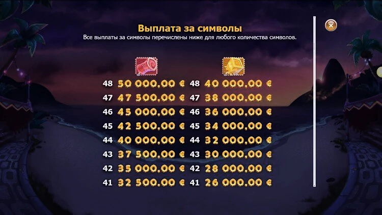 В игре присутствуют высокооплачиваемые символы, украшенные разнообразными красочными карнавальными изображениями, каждое из которых имеет свою цветовую гамму. Формирование выигрышных комбинаций с этими символами может принести внушительное вознаграждение в размере от 24 до 30.000 монет в зависимости от количества одинаковых символов, выстроенных на линии выплат. Кроме того, есть и низкооплачиваемые символы, похожие на разноцветные бриллианты, которые предлагают выплаты от 6 до 3.000 монет за комбинации с ними.