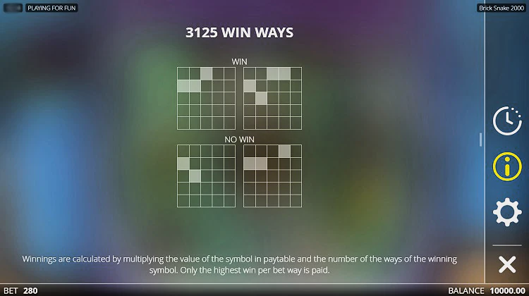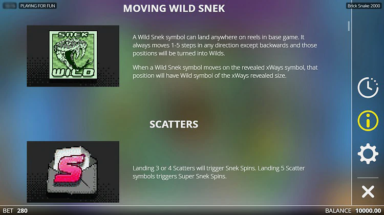 Базовая игра в Brick Snake 2000 запускается на поле 5х5. Она работает в привычном формате: нужно ловить комбинации из 3 и больше одинаковых символов. Wild в слоте отсутствует, зато есть картинка Scatter. Основное преимущество аппарата – это его специальные режимы.