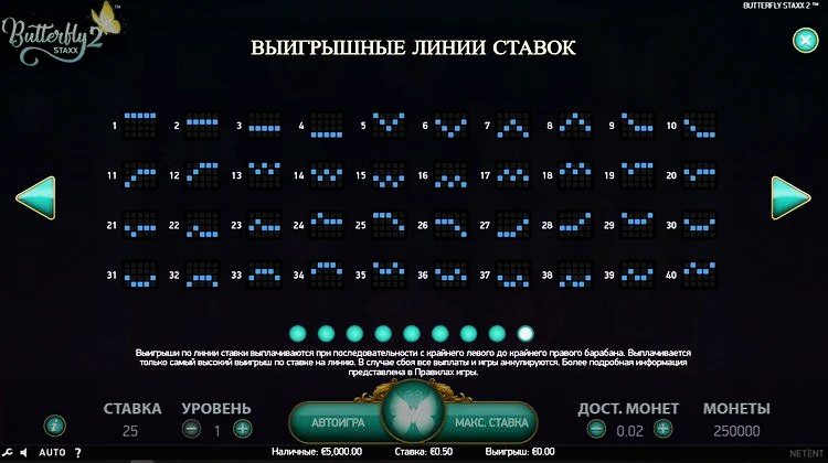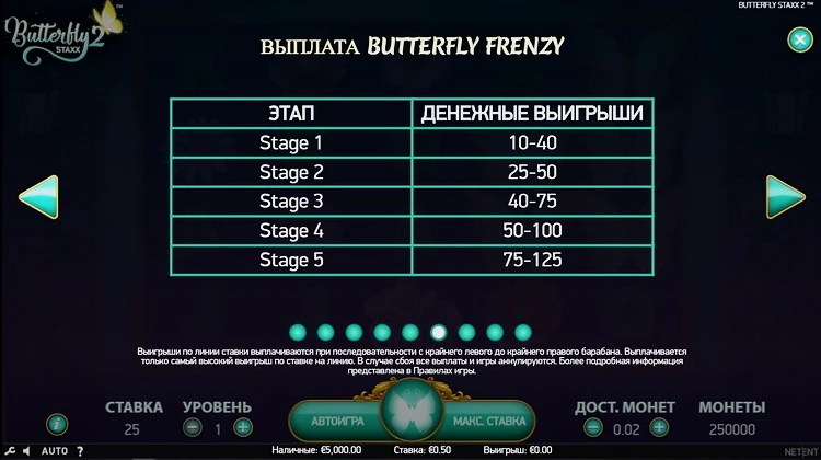 Релиз игрового автомата Butterfly Staxx 2 вышел в 2019 году. Минимальная ставка составляет 0,25 кредитов. Максимально можно проставить 1250. Стоимость кредита эквивалентна вашему кошельку, NetEnd работает с валютами: рубль, доллар, евро.