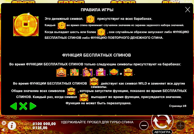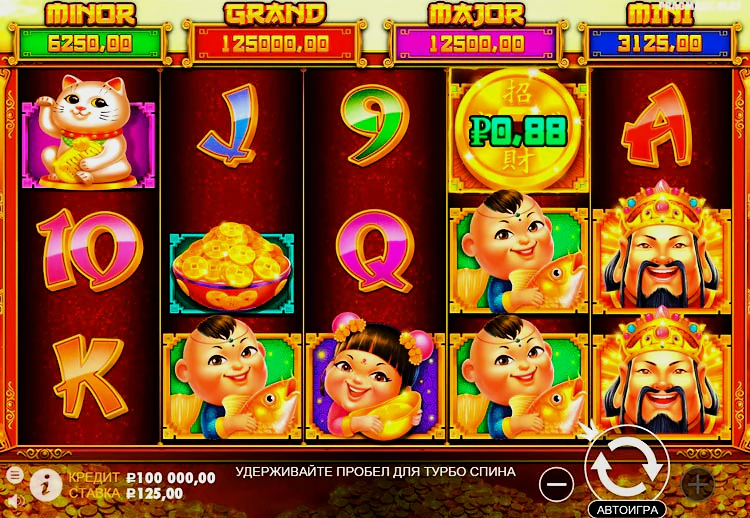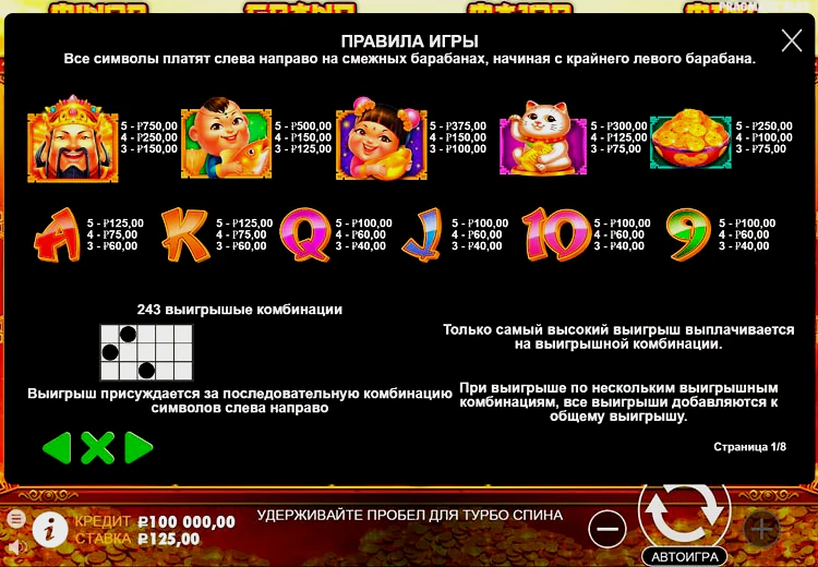 Онлайн-слот предлагает 243 способа выиграть. Широкий выбор ставок от 25 до 125 монет, делает Caishen’s Cash подходящим как для хайроллеров, так и для игроков, предпочитающих копеечные слоты.