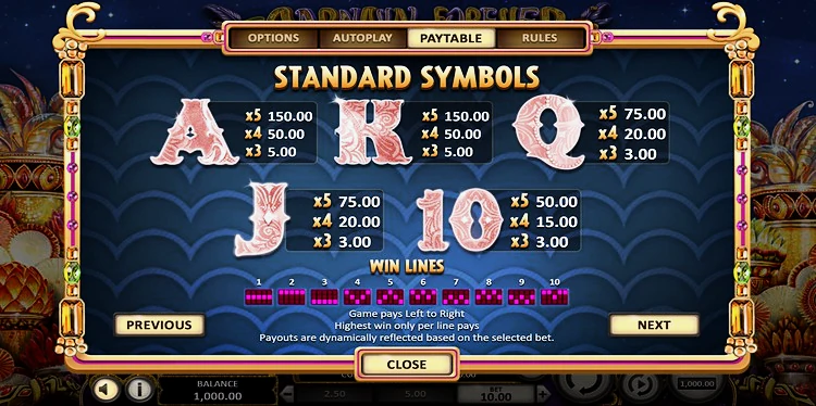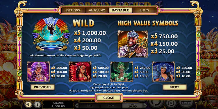 В Carnaval Forever вы найдете пять низкооплачиваемых символов и пять высокооплачиваемых. Десятка оплачивается от 3x до 50x ставки на линию за три-пять одинаковых символов, а валет и королева — от 3x до 75x. Символы короля и туза платят от 5x до 150x.