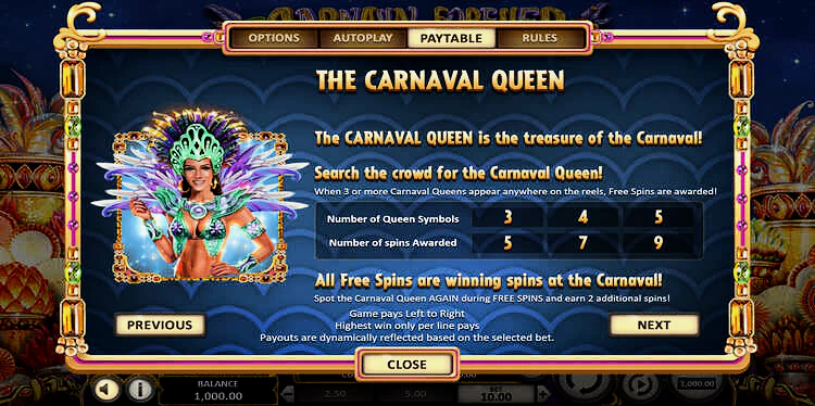 Carnaval Forever — последнее красочное дополнение к линейке онлайн-слотов Betsoft. В отличие от многих других игр Betsoft, здесь всего 10 линий выплат. Все линии выплат фиксированные. Ставка на монеты составляет всего 0,01, а минимальная ставка — 0,10 на спин. С помощью удобного ползунка вы можете регулировать ставку в большую или меньшую сторону.