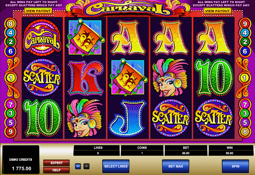 Пришло время начать вечеринку в честь Карнавала. Компания Microgaming не осталась в стороне от темы Марди Гра: клоуны, красивые головные уборы и трубы на пяти барабанах и девяти линиях слота Carnaval с вайлдами, скаттерами, множителями и джекпотом.