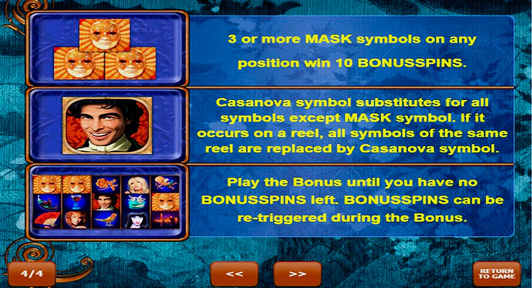 В данном слоте в роли спецсимволов предстают Казанова и таинственная маска. Персонаж Казанова выступает в качестве символа Wild, в то время как маска играет роль скаттера. Казанова обладает способностью заменять все символы на игровом поле, кроме маски, что значительно облегчает формирование успешных комбинаций для получения выигрыша.