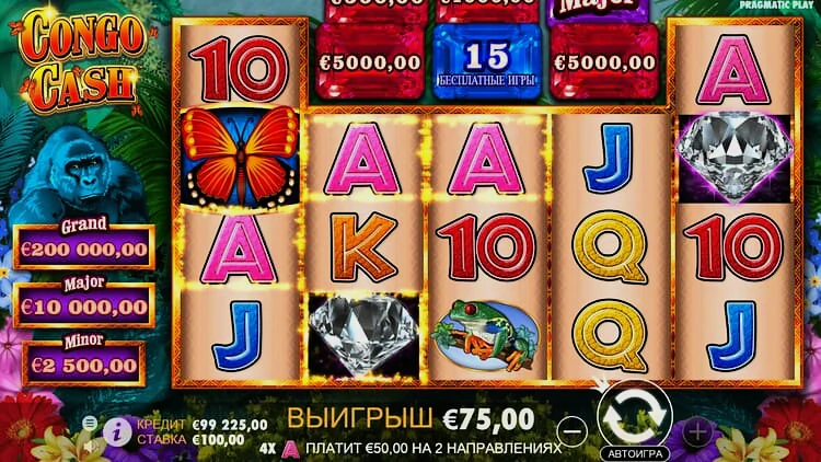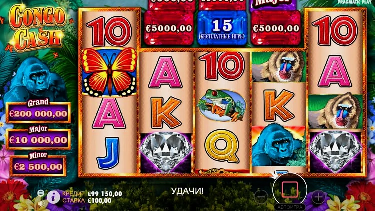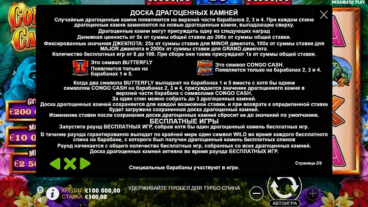 Для активации призов с Доски драгоценностей необходимо поймать 2 символа бабочки на первом и последнем барабанах, а также символы Congo Cash на 1 из 3 средних барабанов.