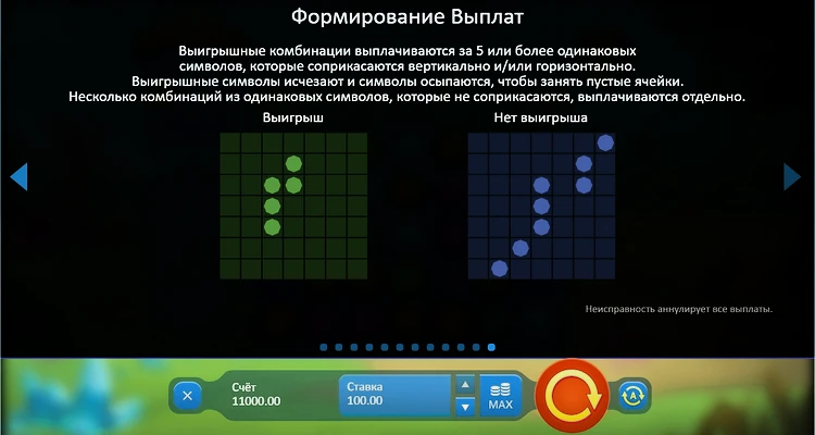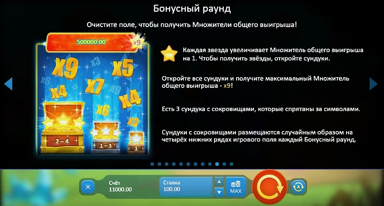 - Если игроку удается очистить все 49 ячеек от символов, запускается бонусный раунд: