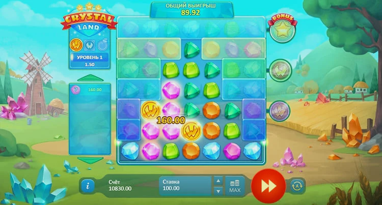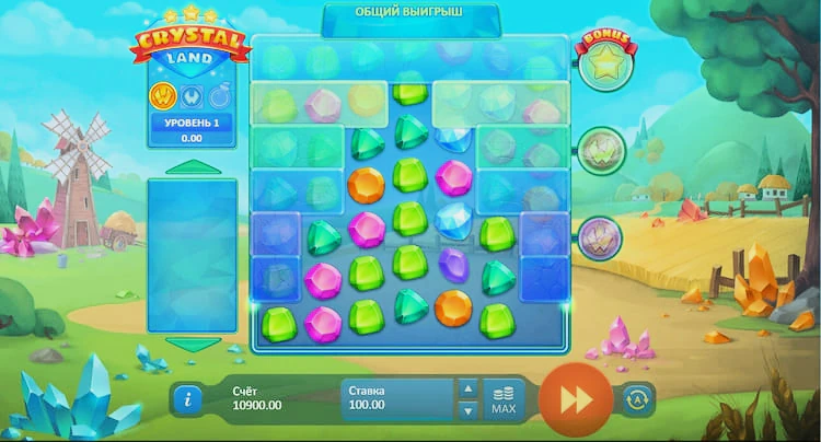 Первым шагом в игре является выбор размера ставки с использованием кнопок в нижней части экрана. В Crystal Land символами служат разноцветные кристаллы: синие, оранжевые, розовые, зеленые, голубые и фиолетовые. У каждого кристалла своя ценность, и, естественно, выплаты зависят от количества одинаковых кристаллов в комбинации.