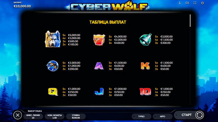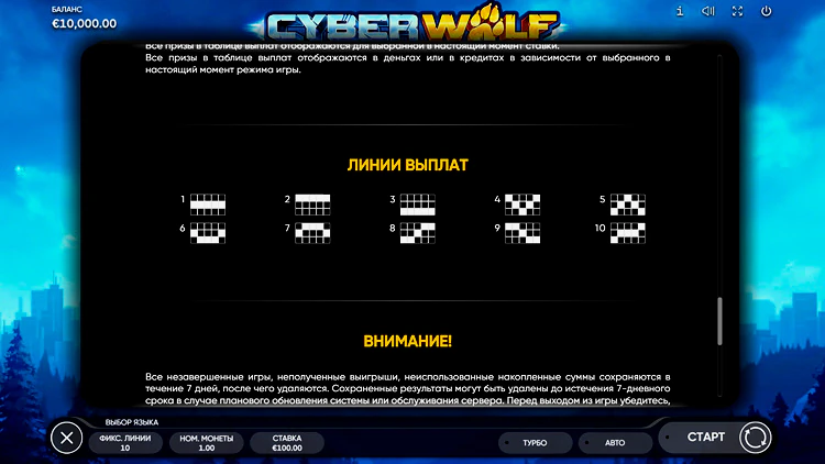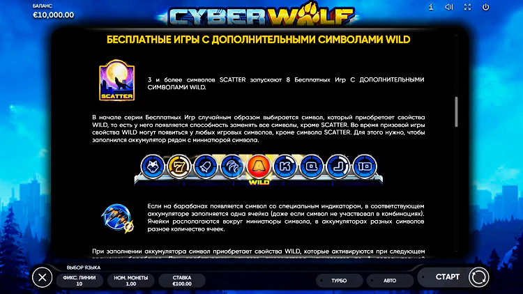 Автомат Cyber Wolf пополнит счет гемблера при выпадении 3 и более одинаковых символов на линии. Количество победных графиков фиксированное: здесь может быть лишь 10 активных линий.