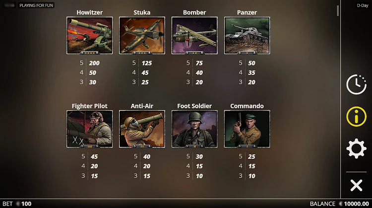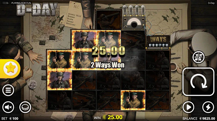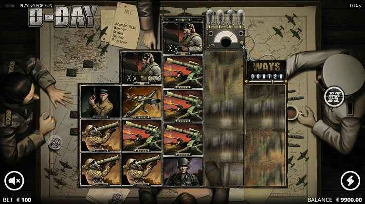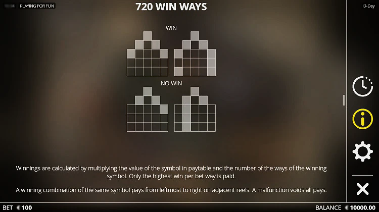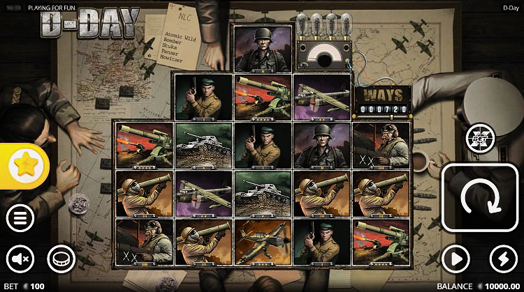 - Разберитесь с линиями выплат: В игровом автомате D-Day используется уникальное расположение барабанов 3-4-5-4-3, предлагающее 720 способов выиграть. Чтобы получить выигрыш, вам необходимо выпадение трех или более одинаковых символов на соседних барабанах, начиная с барабана 1.