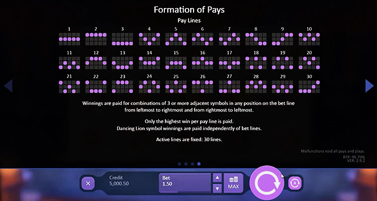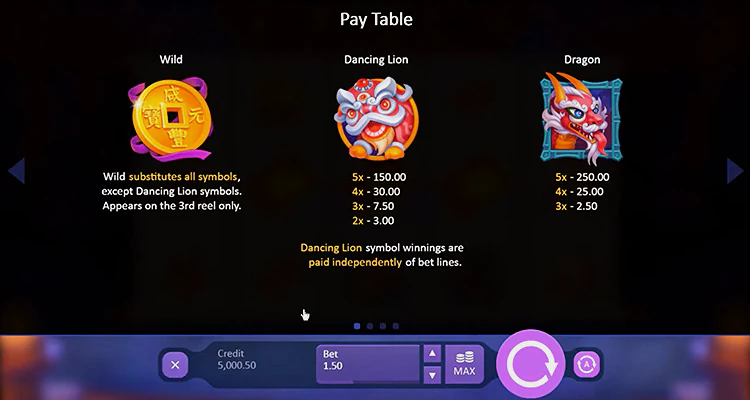 Кроме того, символ Scatter, который выглядит как танцующий лев, имеет решающее значение для получения крупных призов. Выпадение двух или трех скаттеров в любом месте на барабанах умножает общую ставку на 100.