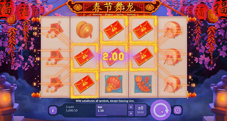На экране игрового автомата появляются различные изображения и символы, которые обычно ассоциируются с китайским праздником: красные конверты, барабаны, цимбалы, фонари, львы и драконы. Символ дракона является самым прибыльным, обеспечивая значительную выплату, более чем в 166 раз превышающую вашу ставку, когда пять одинаковых символов совпадают на одной игровой линии.