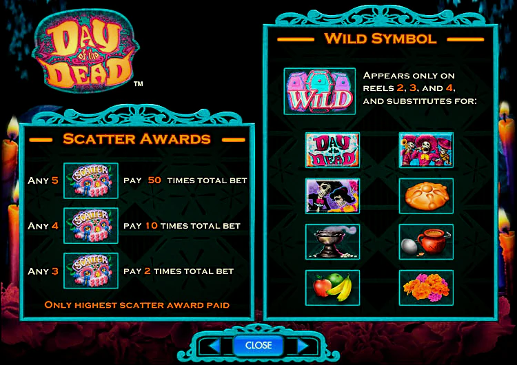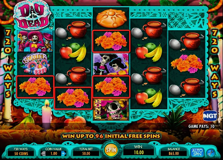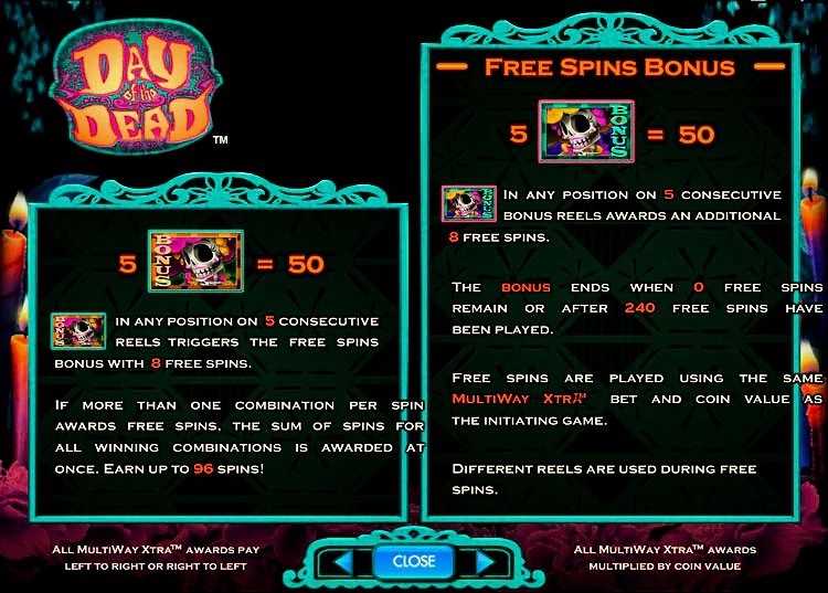 В этом слоте также есть стекированные вайлды, которые могут увеличить ваш выигрыш каждый раз. Особенно привлекательны бонусные раунды, которые запускаются при появлении пяти и более бонусных символов на соседних барабанах. Во время бонусного раунда вы можете выиграть бесплатные игры и получить в общей сложности до 240 бесплатных игр. Именно такое количество бесплатных игр делает Day of the Dead обязательной игрой для любого поклонника слотов.