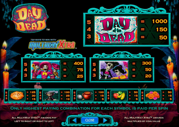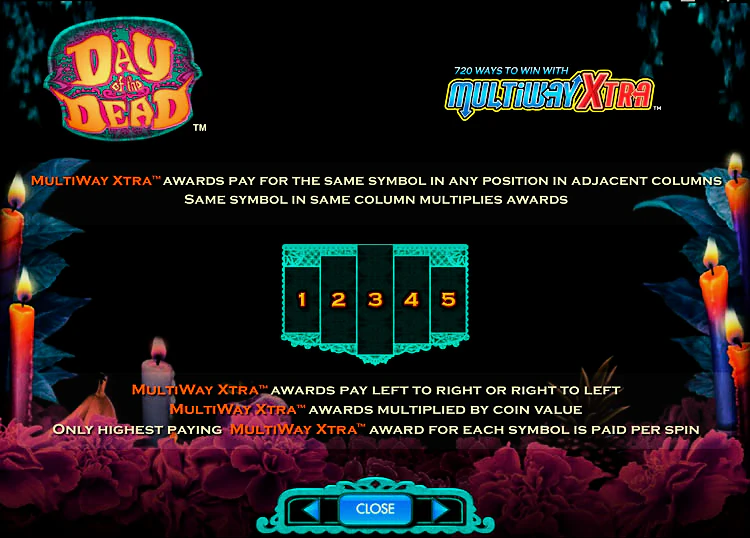 Day of the Dead от IGT — одна из лучших игр, созданных компанией. Она оснащена механикой MultiWay Xtra, которая предоставляет 720 способов выиграть. Вы можете получать выплаты как слева направо, так и справа налево, что увеличивает ваши шансы на выигрыш при каждом вращении.
