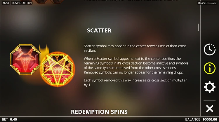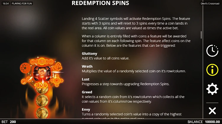 Redemption Spins можно улучшить, собрав 4 уровня в панели улучшений или когда все 4 скаттера приземляются рядом с центральной позицией в основной игре. Монета дьявола запускает функцию для своего столбца, а при повышении уровня также активирует функцию для своего ряда.
