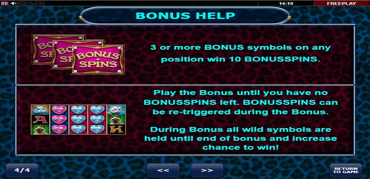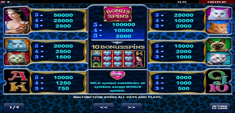 Данный слот во многом рассчитан на игроков женского пола, впрочем, нравится он и мужской половине игорной индустрии, и включает в себя гламурные символы, такие как кошки и сверкающие бриллианты. Особо прибыльные выигрышные комбинации на активных линиях можно получить с помощью диких и бонусных символов, а также собрав в ряд не менее трёх обычных символов.