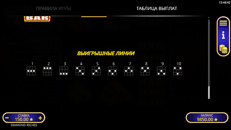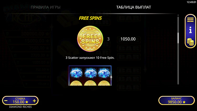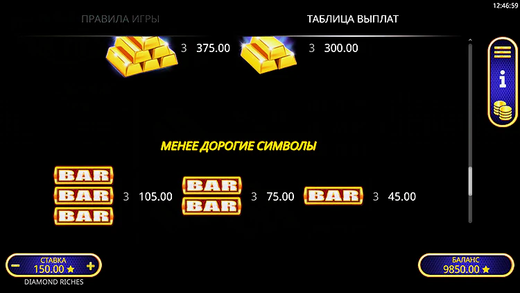Давайте посмотрим на выплаты за некоторые комбинации в демо версии слота Diamond Riches: