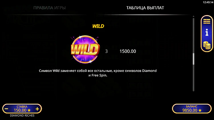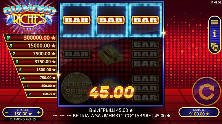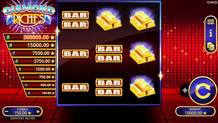 Следует играть в Diamond Riches с ответственным подходом — выделить определенный бюджет и не выходить за установленные рамки. Автомат можно запустить с любого устройства — мобильного или ПК. Слот позволяет получить реальный выигрыш и развлечься в дополнительных уровнях бонусной игры.