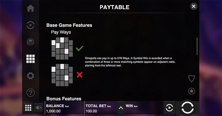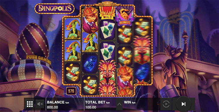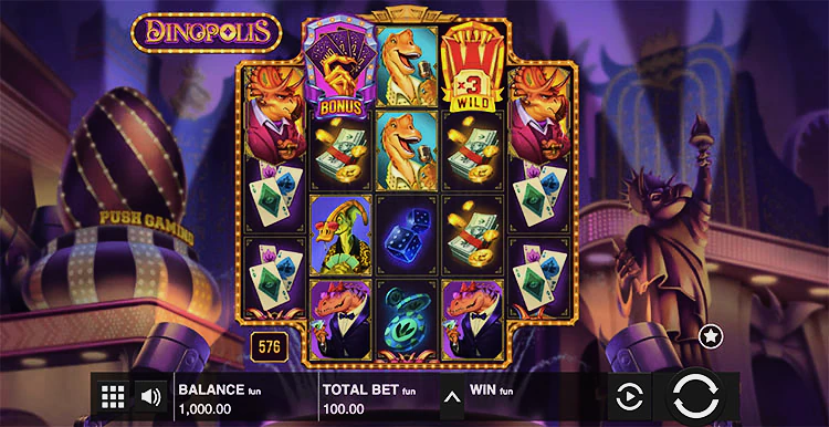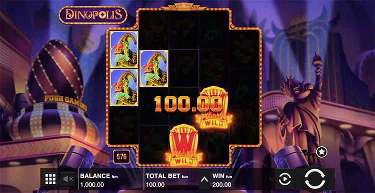 Можете играть в городе динозавров, собирать крутые выигрышные комбинации и получайте дополнительные функции.