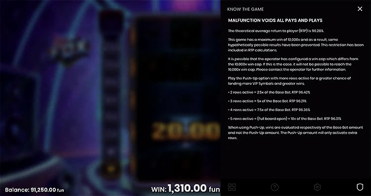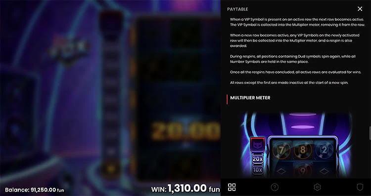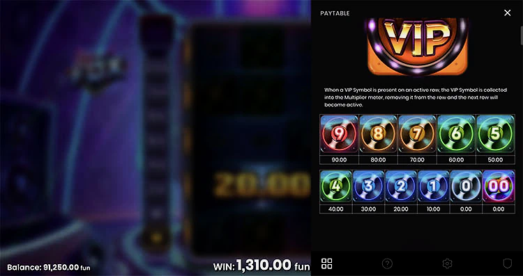 Если вам удастся активировать все ряды с VIP-символами (или выбрав все 5 рядов при выборе ставки), ВИН-карточки активируют счетчик множителя. Первые два слота на счетчике множителей ничего не делают, за исключением того, что приводят вас к первому множителю. Итак, вам нужно собрать не менее 3 VIP-символов, чтобы начать активировать множители. Максимальный множитель равен 20x.