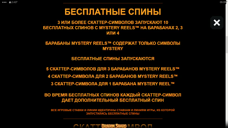 В слоте Dragon Shard функция бесплатных вращений активируется при одновременном выпадении не менее трех скаттеров в виде Ока дракона за одно вращение. После этого вам будет предоставлено 10 фриспинов, и каждое бесплатное вращение сопровождается тем, что с 1-го по 3-й средние барабаны наполняются мистери символами. На этих барабанах вы будете видеть исключительно мистери символы.